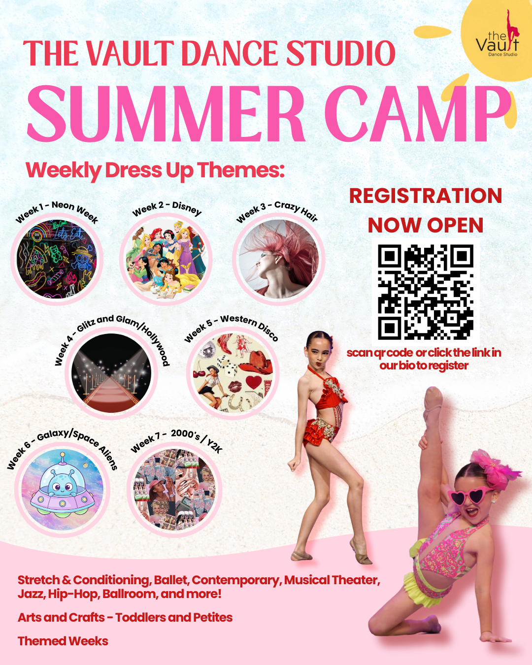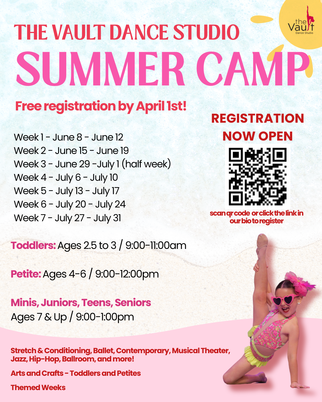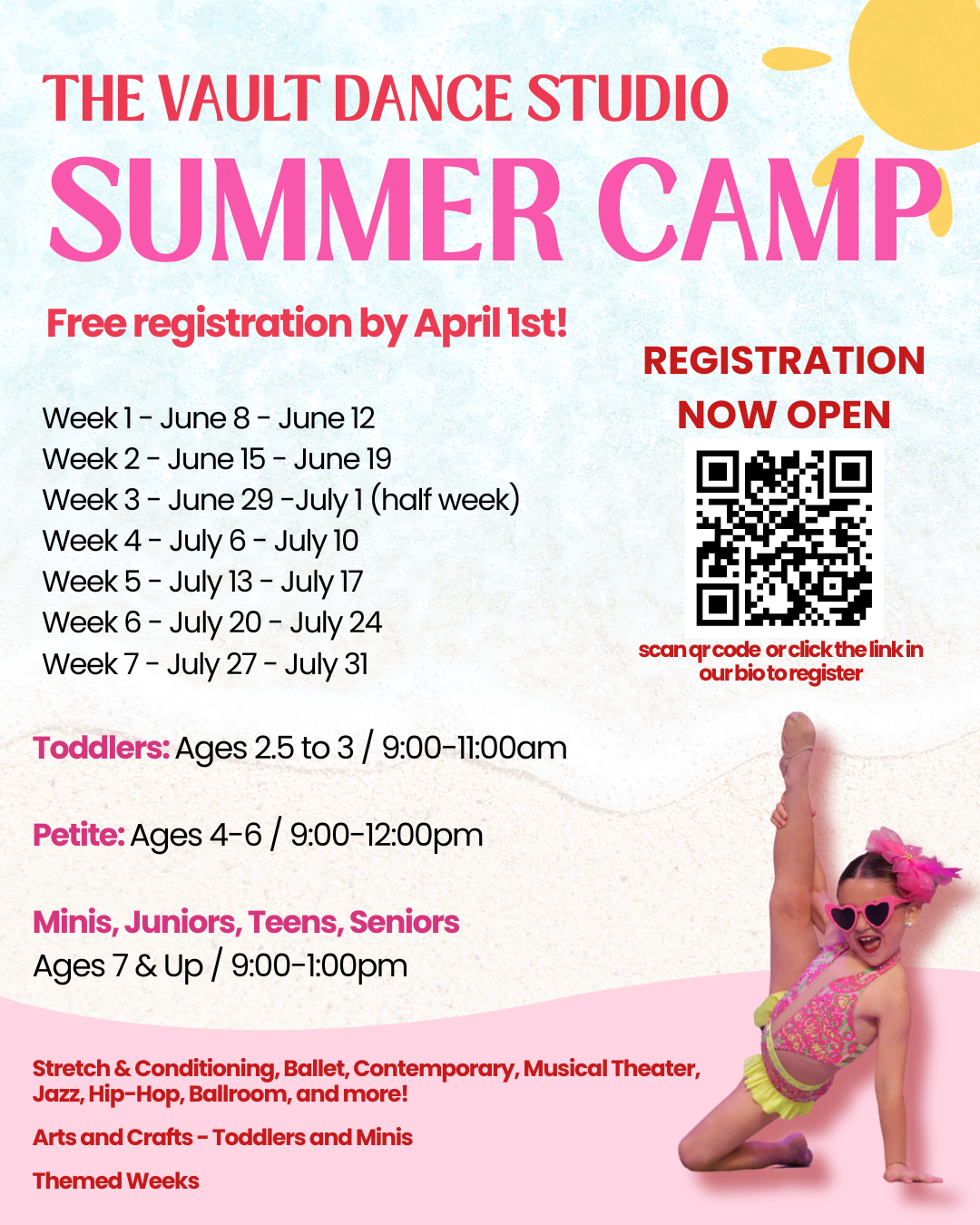 Registration: $95.00 for non studio members and $85.00 for studio members. If you pay for one week of camp before April 1st, we will waive the registration fee. *Company members must complete at least 2 weeks in order to be eligible for the 2026-2027 season.